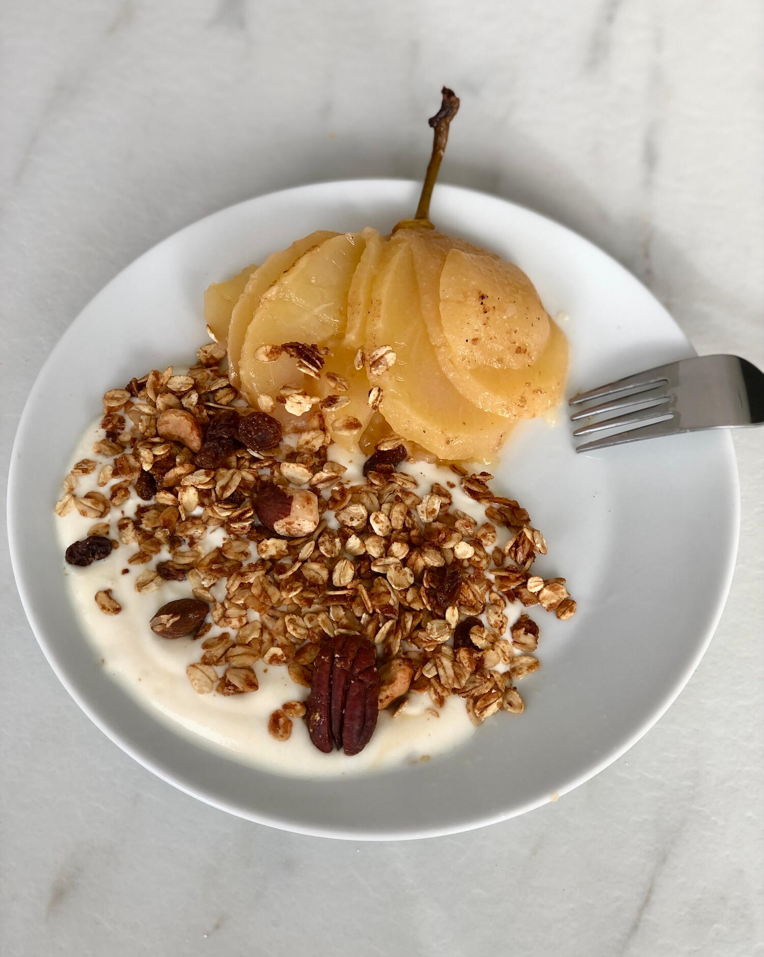 - 30g de granola Simply Good.Mélanger le yaourt avec le sirop d'érable. Garnir avec les fruits et parsemer de granola. Le parfait petit déjeuner!