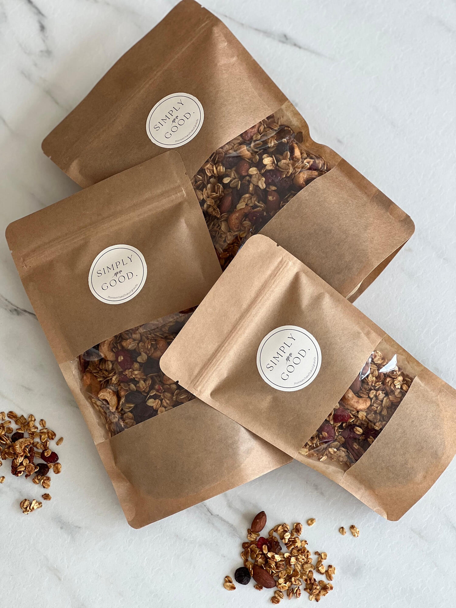 Découvrez le granola artisanal Simply Good. Une recette premium conçue pour les amateurs de saveurs authentiques et de bienfaits nutritionnels. Un granola préparé de façon artisanale en petites quantités pour garantir la fraîcheur et la qualité.Élaboré à partir d’ingrédients de qualité, le granola Simply Good. est un concentré de bienfaits pour la santé. Chaque ingrédient, soigneusement sélectionné, est peu transformé et cuit à basse température pour préserver ses qualités nutritives.Avec une base de flocons d'avoine à l'ancienne, le granola Simply Good. est non seulement riche en fibres, mais également en fer, en antioxydants essentiels, et en graisses saines grâce à son délicieux mélange de noix.Ce granola 100% fait maison est sans huile de palme, sans additifs, sans colorants, sans conservateurs et sans saveurs artificielles.INGRÉDIENTS: Flocons d’avoine 44% (GLUTEN), Mélange de noix 18%: cajou, amandes, pécan (FRUITS À COQUES), Raisins secs et Cranberries 16%, Cassonade, Sirop d’érable, Huile végétale, Cannelle, Sel. ALLERGÈNES: voir ingrédients en gras. Peut contenir des traces d’arachides, sésame et soja. Contient des fruits à coques.